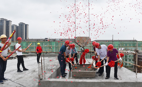 6月2日上午10点08分,在热烈的掌声和礼炮声中,我校全体在校校领导铲起混凝土为新建第16栋学生公寓楼封顶,共同见证了公寓楼最后一块混凝土板的浇筑过程。校后勤基建处、公寓楼施工方及监理方负责人出席了封顶仪式。