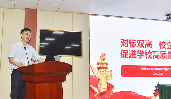张永龙作了“对标双高,校企携手,促进学校高质量发展”主题报告,展示了美和易思自主研发的各项新技术系统,及助力学校双高建设及高质量发展的可行方案及案例。