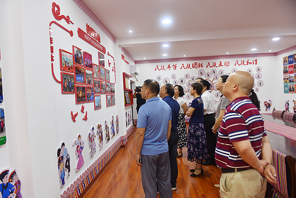 刘鸿伏一行在参观我校校容校貌后,来到校内的娄底市民族团结进步教育基地展览室参观。他们认真观看着室内的图像文字资料,尤其对我校的“娄职一家亲民族文化交流歌舞晚会”视频表现出了极大的兴趣。调研组一行人也纷纷用手机等记录下展览室的精彩之处,大家表示“内容丰富多彩,值得一看”。