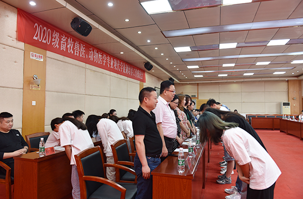 “请各位同学向企业导师行拜师礼!献敬师茶!”5月16日上午,在主教学楼报告厅,在农林工程学院院长禹华芳、党总支书记王冬青主持下,2020级畜牧兽医与动物医学专业学生向自己的企业导师们恭敬地鞠躬行礼,献上敬师茶,开启了别具特色的校企师生情缘。