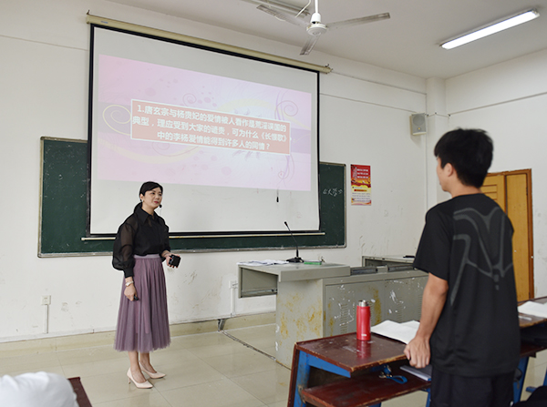 课程正式开始后,邓梦兰老师以悠扬的《梁祝》配乐导入新课,从《礼记·大学》“古之欲明明德于天下者,先治其国;欲治其国者,先齐其家;欲齐其家者,先修其身。”阐述了树立正确的爱情观对一个人修身、立业的重要性。在简单复习此专题前几次课内容框架后,引出本堂课要完成的主要任务。同学们积极热情,主动回答问题。随后,邓老师要求同学们分组讨论“当今大学生应该树立怎样的爱情观?”每组代表上台发言,陈述了各自的观点。
