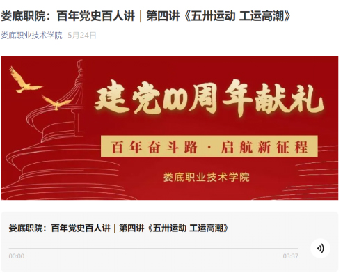 六是利用融媒体平台开展“百年党史百人讲”、“红色娄底”等专栏宣传。利用娄底职院官微、微博、抖音号等,推出了“百年党史百人讲”专栏,讲述了五四运动、五卅运动、红船故事等;“红色娄底”故事专栏,讲述了蔡和森、李聚奎、成仿吾、陈正湘、红二六军团进新化、特别的党费缴纳单等故事。