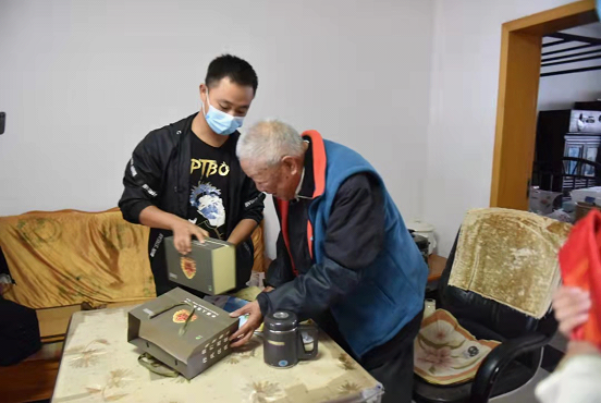 爱心志愿者为老人准备了保温杯、水果、毛毯、围巾、帽子、手套等慰问品。