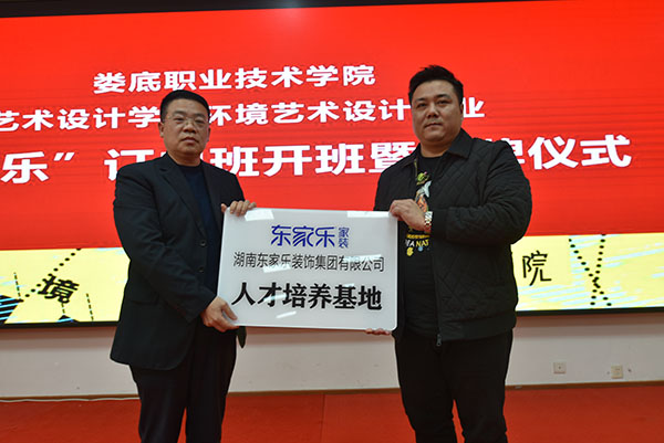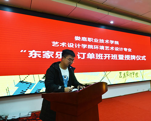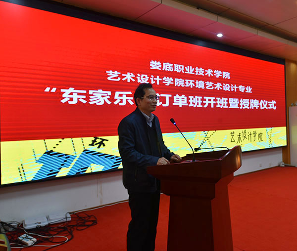 12月9日下午,艺术设计学院环境艺术专业“东家乐”订单班开班暨授牌仪式在多功能报告厅举行。东家乐装饰集团部分代表,校长张征澜,副校长游新娥、欧芳,产教融合办主任晏然,艺术设计学院院长夏高彦、党总支书记曾晓杰,副院长张海峰、张雯宇,环境艺术专业全体教师、辅导员,订单班全体学生和2020、2021部分学生代表参加此次仪式。仪式由夏高彦主持。