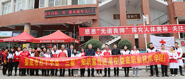 金建雄致辞,向各级红十字会、捐献者家属、志愿者表示最崇高的敬意,指出遗体捐献者为“大体”老师、“无语良师”,他们完美诠释了生命的价值与意义,这项高尚的行为值得所有人尊重。希望医卫专业的同学们将“无语良师”的大爱薪火相传,弘扬无私的志愿者精神,为娄底市医疗卫生健康服务贡献更大的力量。