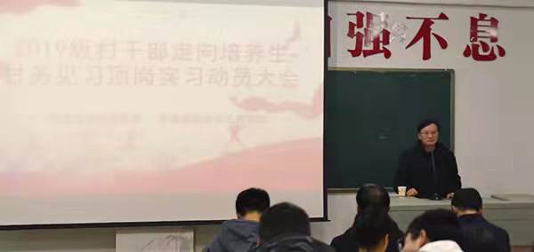 12月28号下午,农林工程学院举行2019级村干部定向培养生顶岗实习动员大会。娄底市委基层党建工作领导小组办公室主任袁送荣,娄底市委组织部组织一科科长梁鹏,农林工程学院村干部定向培养工作负责人刘梅秋,党总支书记王冬青,全体顶岗实习指导老师出席,2019级全体村干部定向培养生参加。本次动员大会由农林工程学院副院长谢大识主持。