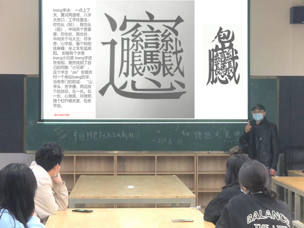 讲座从我国传统汉字合体字导入,将人们生活中常见的合体字,“招财进宝”、“道法自然”、“喜气临门”西安合体字“Biáng”作为切入点,并引入当下优秀合体字设计作品,带领学生们认识合体字,正确拼读识别合体字的读声,学习经典合体字作品,分享合体字与字体设计的融合。讲座最后还结合了我国著名现代汉字合体字大家徐冰老师的作品,让学生再度思考汉字及传统文化创新的途径。