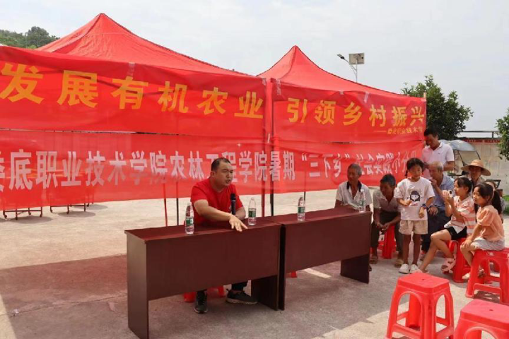 7月31日,学院领导、带队老师和队员们冒着酷暑,现场给村民进行农业知识传授、问询,三下乡活动组的农技专家耐心地为村民答疑解惑,并借机开展涉农政策、法规政策宣讲及农业技术指导。张文泉教授在村委会前坪以“发展有机农业、引领乡村振兴”为主题的讲座,通过讲座,现场群众和志愿者们获得了有关有机农业的知识和技能,并激发了他们对于可持续发展的关注。张文泉教授为本次活动提供全程技术指导。