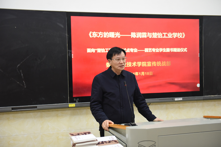 为传承楚怡工匠精神,培养学生爱读书读好书的良好习惯,1月18日上午,在“楚怡·园艺”——学习竞赛活动周启动仪式上,学校党委宣传统战部在主教学楼505室为我校“楚怡工匠计划“试点专业——园艺专业学生赠送了《东方的曙光——陈润霖与楚怡工业学校》图书。宣传统战部副部长刘艳,农林工程学院院长禹华芳,副院长王琦、谢大识,辅导员肖姣娣、周永胜、周凌博老师参加了本次活动。