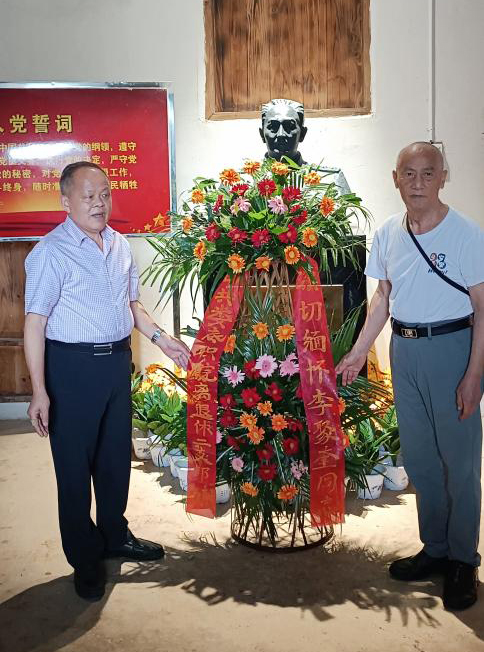 二党支部老同志们来到李将军故居后,先向李聚奎将军塑像敬献花篮,党支部书记周意坚和颜东柳同志庄严恭敬地整理好花篮。大家向李聚奎将军塑像三鞠躬,组织委员张建良领着大家重温了入党誓词。