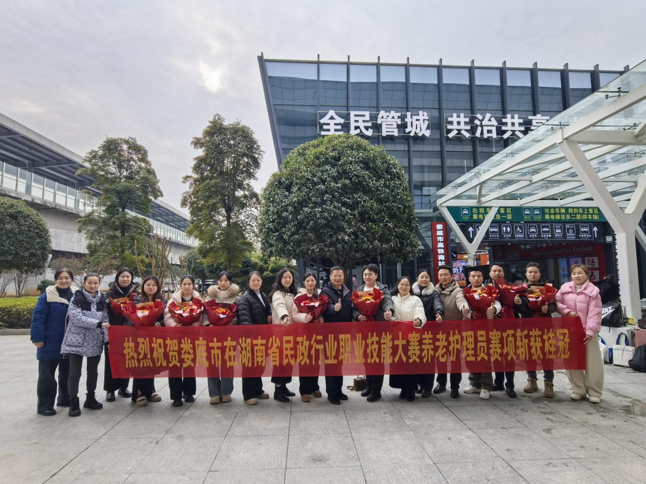 1月22日下午,初雪渐融、寒风凛冽,娄底市民政局相关科室与我校护理学院的相关负责同志等一行人手执鲜花,在高铁南站出站口热情地迎接娄底市参加省第二届民政行业职业技能大赛的参赛选手载誉归来。