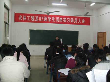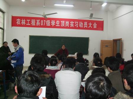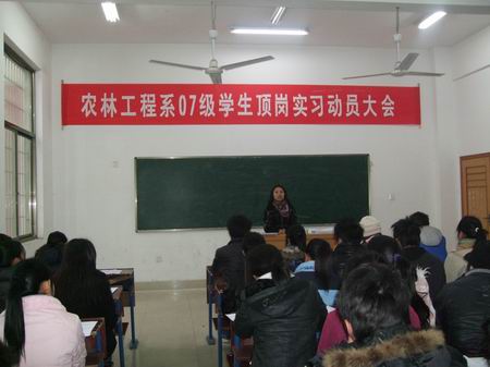 2010 年元月6日,我系在主教学楼召开了07级毕业生顶岗实习动员大会。系部负责人和全体专业教师参加了本次会议,大会由教学主任禹华芳主持。07级学生是我系的第一届毕业生,有园林技术、畜牧兽医两个专业共48名学生。顶岗实习是同学们在校学习的最后一个重要内容,又是检验学生掌握知识和提升职业技能的重要一环;更是学生迈向社会、接触企业、走向工作岗位的第一步。在动员大会上,李九如主任介绍了系部在就业工作中做出的努力,要求老师们牢记自己的使命和肩上的责任,认真履行好工作职责,克服各种困难,多花时间与精力,想方设法指导和带领同学圆满完成“顶岗实习”任务;要求同学们面对现实,在就业难的今天,一定要珍惜工作机会,严格遵守单位纪律,在工作上要虚心请教,要看、多问、多动手,尽快熟悉业务、掌握技能,成为技术骨干、彰显高职学生的良好素质与形象。学工主任罗莉萍鼓励同学们走出校门后,要继续发扬农林系吃苦耐劳的精神,从小事做起,在工作中学习,在学习中工作,为学弟学妹树立一面旗帜。教学主任禹华芳从教学的角度讲解了顶岗实习计划的具体内容,尤其是对毕业论文设计进行了重点讲解和安排,再三叮嘱同学们要按要求保质保量完成学习任务。顶岗实习动员大会在热烈的掌声中划下了圆满的句号,相信我们07级的毕业生们将铭记“自强不息、学以致用”的院训,在顶岗实习的岗位上干出优异成绩,开拓自己光辉的就业、创业前景!为报效祖国,致富家乡早日闯出属于自己的一片天地! (文:潇潇)