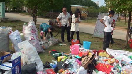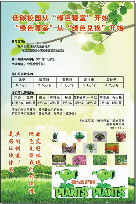11月2日,学院北院食堂草坪上出现了一个特殊的展位。只见好多学生手提肩扛地拖着大包小包的空矿泉水瓶子、空饮料瓶、啤酒瓶等来到展位前,身披欢迎授带的工作人员接过装满废品的编织袋,一个个点数、换算,然后兑换成等值的绿色盆栽交给前来兑换的学生。此活动为农林系主办的“绿色宿舍”系列活动之一――“绿色兑换”活动,其新颖的形式和倡导绿色环保意识的主题让许多学生深表认同。上午10点,副院长刘自斌、学工处副处长江国元、农林系副主任易瑜亲自莅临并参加了此次活动。