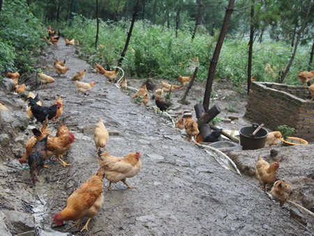 上午,一行人在月塘村山地养鸡场创办人我系10级畜牧班曾娜学姐的热情欢迎下参观了山地养鸡,曾娜学姐介绍:目前养鸡场大约现有200平米,养了1000只良种三黄鸡。队员们和指导老师们在参观了由曾娜亲自动手搭建并架设电线、水管的鸡舍后,由衷地竖起了大拇指。指导老师针对山地养鸡应注意的一些问题及其在养殖过程中遇到的问题提出了有针对性的建议和意见。