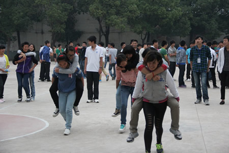 每天早6:10分“30分钟”广场团队竞技活动在培训楼前篮球场举行。活动在第1组所组织的《双人往返接力》活动中开始。30分钟中,第1组8个成员分别担任了讲解员,示范员,计时员,裁判员等职务,成功组织了其他五个组进行了两轮比赛,取各组最少用时排出了名次,算出各组单项活动积分。其后,由第二组组织了《心有灵犀》,第三组组织了《踩气球》,第四组组织了《夹气球》,第六组组织了《乒乓接力》等活动,每天篮球场上热闹非凡。由学工主任易瑜带队,第六届团总支、学生会主席团、各部门部长、实习部长们组成了现场评审团兼啦啦队,为新干部们加油鼓劲之余不忘认真观察各组表现。