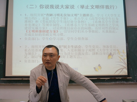 11月10日晚,为使我系“与文明携手、创和谐校园”为主题的大学生基础文明养成暨优良学风系风建设活动精神深入每一个同学的心里,在全系学生中开展以“与文明携手,创和谐校园”为主题的大学生基础文明教育活动的主题班会。