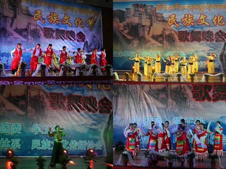 文艺汇演由来自西藏昌都地区民族舞蹈《太阳从东边升起》拉开序幕。各民族同学欢聚一堂,表演了充满浓郁的民族特色的节目:有时代气息与民族文化结合的街舞;激昂高亢的独唱《天籁之音》、《爱琴海》,地域特色鲜明的群舞《金马靴》、《卓玛》、《欢聚一堂》……一个个精彩的节目引来欢呼声、掌声、笑声不断,现场掀起了一次次高潮。