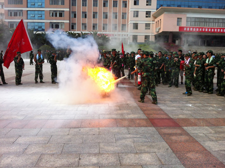 安全消防疏散演练进行灭火技能培训。我系教官从如何预防火警、火场自救以及逃生注意事项等安全基本常识进行了详细讲解,还现场演示了灭火器的操作程序。随后让同学们进行实地演练,真正的做到具体的实战演习。