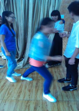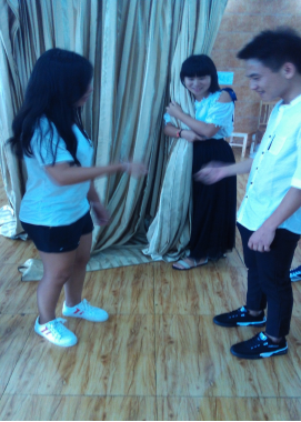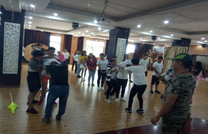 到达训练场地后,未经休息,马上进行破冰环节。在专业教练的指导下,参与培训的全体人员不分职务、不分年龄、不分性别随机组建成4个团队,每支队伍快速制订各自队名、队歌、口号,形成了团队文化。训练中先后开展了“猎人与老虎”、“报告魔王”、“急速旋转”、“衣服接力”等训练项目。