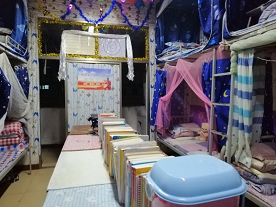 女生寝室温馨雅致,同学们对宿舍的墙体、天花板、门窗进行了精心的装饰——有的贴了绚丽的墙贴,有的挂了可爱的手工风铃。蓝色的“海底世界”,橙色的“梦想屋”,红色的“主题酒吧”等用新奇的涂鸦来引人注目,还有那字迹隽永的书法——《离骚》。男生寝室则以干净整齐、简洁大方著称。