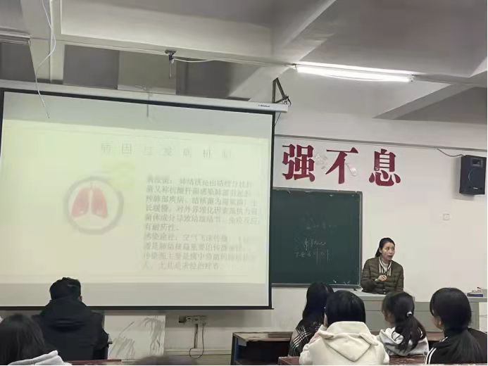 班会开始,柳菲老师以ppt的形式给同学们详细讲解什么是肺结核,让同学们了解到这是一种严重危害人们健康的慢性呼吸道传染病,如果不及时治疗,对病人而言会造成肺的损伤,影响个人的工作生活,严重的甚至会危及生命。并且说到如果出现有咳嗽,咳痰超症状的“肺结核可疑症状者”,最好先到结核病防治机构或结核病专科医院进行检查。最后柳菲老师重点强调同学们要加强体育锻炼,注意饮食营养和睡眠充足,增强机体抵抗力,避免发病机会,培养良好的卫生习惯,咳嗽、打喷嚏时应用纸巾捂住口鼻,不要随地吐痰,避免结核病菌通过飞沫传染其他人。