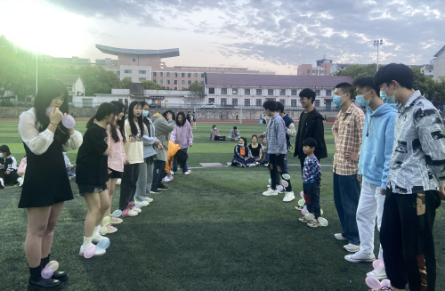 4月4日晚上七点,活动开始,辅导员首先组织同学们戴好口罩围坐一起,然后辅导员开始向同学们讲解活动规则和流程。活动分为三个环节 ,分别是踩气球大作战、过人桥大赛、蒙眼抓人游戏。游戏环节一轮接一轮,大家也玩得津津有味,乐在其中,欢声笑语环绕于傍晚的田径场中。最后游戏结束后,辅导员向同学们强调一定要做好个⼈防护和保证⾃⾝安全的措施。相信春暖花开之时,疫情一定会早日结束。