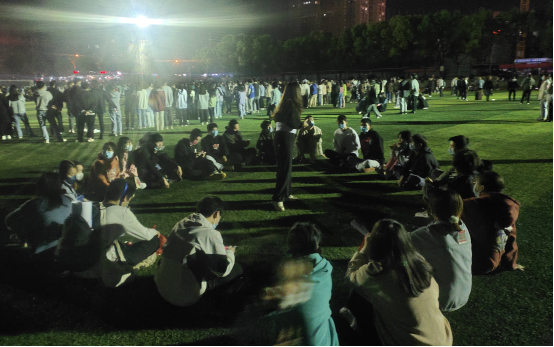 4月2日晚上8点,活动正式开始,大家齐聚田径场围坐在一起,辅导员带领大家围成一圈做游戏,第一个游戏将同学们分成了两对,玩起了老鹰捉小鸡,交代了游戏规则,分配好各自的角色,同学们很快进入状态中:辅导员李老师当起了保护小鸡的母鸡妈妈,担负起保护一群小鸡的重任,老鹰和鸡妈妈在激烈的周旋,鸡宝宝们屏气观察,忽左忽右紧随鸡妈妈身后,整个活动既紧张又刺激,操场上传出一阵阵欢声笑语。之后还进行了丢手绢、你追我赶等游戏活动,活动持续近两个小时,同学们在欢声笑语中意犹未尽地结束了活动。