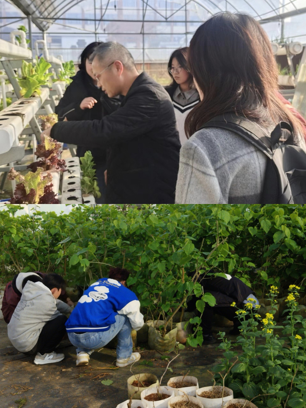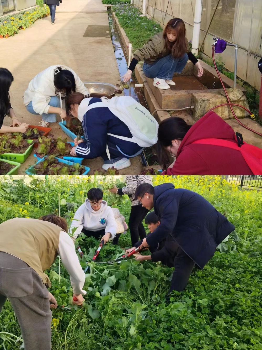 活动开始,周老师向同学们介绍此次实践活动的任务并分为“剪枝”“移植”和“施肥”三个小组,让同学们齐心协力的完成任务。首先移植小组仔细地用铲子将生菜移出培养基质,然后用清水冲洗根部在确保根系完整的同时冲洗掉剩余的泥土,最后再将生菜移植上水培架;剪枝小组熟练地使用大剪刀将田地中的残留枝条修剪干净,并除去杂草;施肥小组提着一桶尿素穿梭在田地间施洒肥料。同学们不怕脏、不怕累认真地对待手中的劳动,在劳动中体验快乐、在实践中学习知识。在活动的最后同学们整理好工具,打扫好卫生。