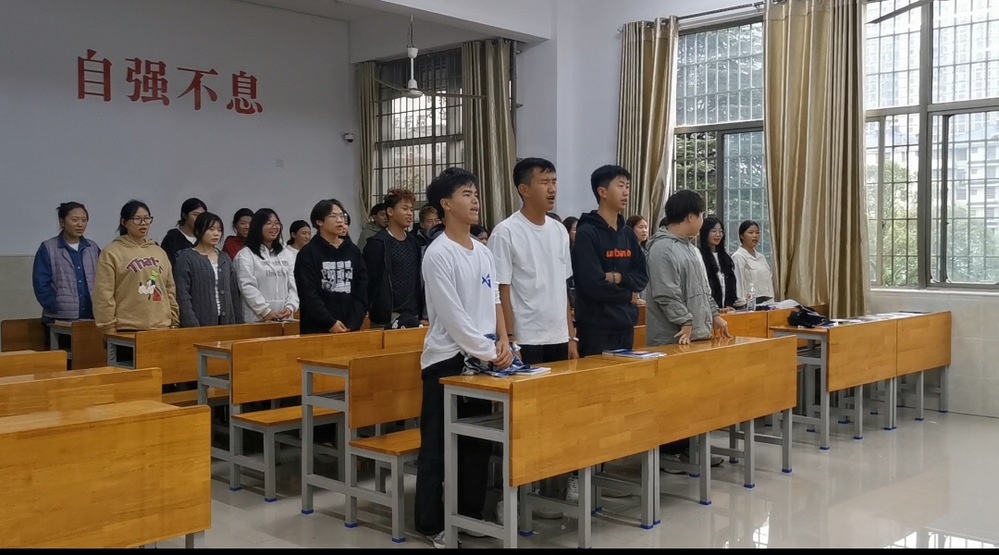 会议伊始,团支书全思瑶请全体同学起立,齐声奏唱共青团团歌。
