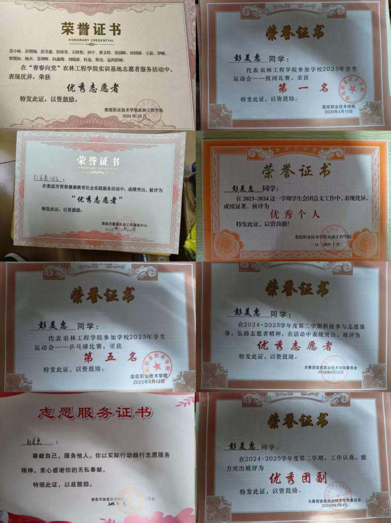 自踏入大学校门,彭美惠始终将学业作为首要任务,凭借扎实的努力多次斩获佳绩:思政类比赛省级三等奖、禁毒主题竞赛二等奖的证书,折射出她对知识的深耕;校级“三好学生”“优秀志愿者”的称号,则是她综合素养的生动注脚。此外,她在体育领域亦有建树,各类奖项为大学生活增添了亮色。“学习如逆水行舟,不进则退。”她坦言,成绩的背后是课堂上的专注与课后的沉淀,“把基础打牢,未来才有更多可能。”