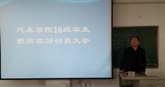 汽车学院为了让学生在校期间扩展专业知识,增加社会阅历,汽车学院依照往常的计划,将大二下学期的学生切身投入到工作岗位中。2018年3月8日,学生归校的第一天,学院教务处安排了跟岗实习老师跟随学生外出实习,于8号晚,汽车学院院长易爱良,副院长聂进,跟岗实习负责老师康兵,以及徐志豪,易向贤,肖俭秀 陈灿波四位老师针对即将实习的大二学生召开了跟岗实习动员大会。本次会议由康兵主持。