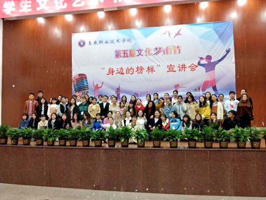 为充分展示全校学生“学以致用、自强不息”的校训精神,挖掘学生中的先进典型、先进人物,弘扬正能量,树立身边的榜样,全面诠释社会主义核心价值观。2017年11月26日晚上7:00文化传播学院承办的第五届文化艺术节“身边的榜样”宣讲大会在新培楼学术报告厅隆重举行。文化传播学院院长刘燕,学工副院长贺建良,教学副院长肖付良,辅导员黄静、柯莎、刘容梅、刘露等老师以及各二级学院学生代表700多人参加。