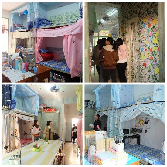 各个寝室风格不一:有在墙上设置许愿树、照片墙、有用自己折的星星、剪的花朵、捡的树叶做装饰的;有把寝室各成员的手掌印满整片墙壁的,还有为过元旦做准备的。更有趣的是每个寝室的名称如:小美好、总经理室、小仙女寝室等等。在她们的巧手下,单调的寝室变成了一个温馨漂亮的小家。