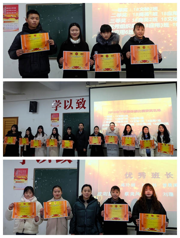接着,主持人宣读了获奖的名单,进行最精彩的颁奖环节,由学院领导及辅导员老师为学生在各项活动中获奖的集体和个人进行颁奖,现场接连不断地响起了热烈的掌声。有优秀班级、2019新年晚会节目、拔河比赛、中文写作比赛等十五个奖项,其中获奖集体47个,获奖个人130余人。