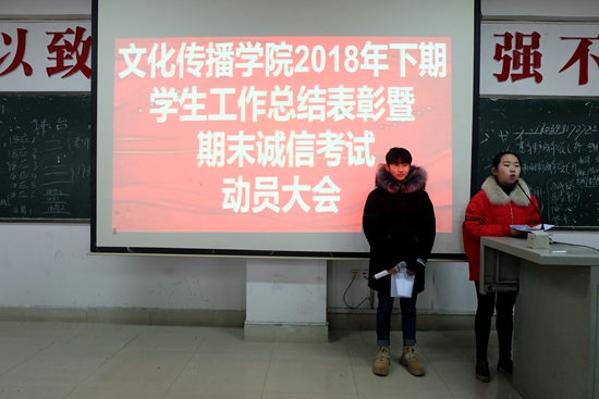 2019年1月9日12:30,文化传播学院在主教学楼501教室举行2018年下学期学生工作总结表彰暨期末考试诚信教育大会。出席大会的有院长刘燕,教学副院长肖付良,学工副院长贺建良,团总支书记胡勇为,辅导员黄静,柯莎,刘容梅,刘露及学生200余人。主持人是18级学生康圩柳、唐海云。