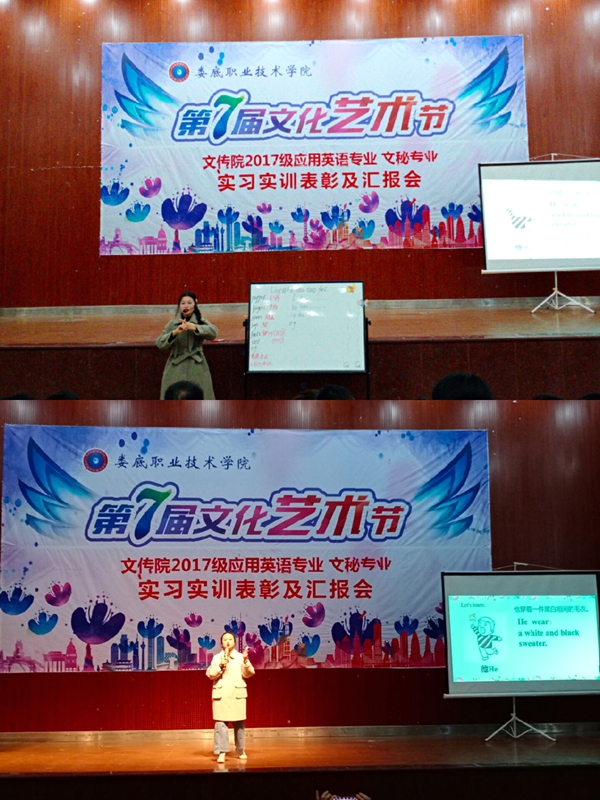 大会第三项是17级应用英语专业全体学生汇报演出,展示实训成果。演出节目共有13组,分别是:《Good morning》《My love circle》、《Animal songs》、《Stars》、 《My love circle》、《Good morning》《Stars》《Colorful world》、《小星星童话剧》、《游子吟》《七言绝句》、《咏鹅》、《游子吟》、《春晓》、《五言绝句》、《小星星童话剧》等。其中小新星实习团队《A Lazy Fly》、格林威尔实习团队《The little lamb and the wolf》带来的节目,将中华古典诗词、少儿童话故事与英语相结合,演绎的绘声绘色,赢得观众阵阵掌声。