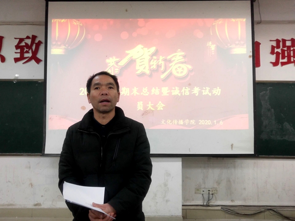 2020年1月6日中午12:00,文化传播学院于主教楼110举行2020下学期期末诚信教育暨学生工作总结表彰大会。出席本次大会的有教学副院长肖付良,学工副院长贺建良,彭佳、黄静等各班辅导员,学生会全体成员、各班班长以及团支书。本次大会由许中龙、李秋萍主持。