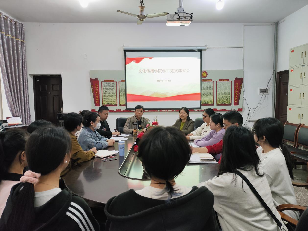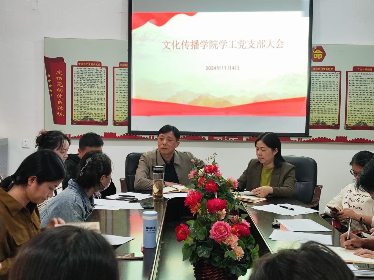 2024年11月4日下午16:30,文化传播学院在北科楼209召开文化传播学院党支部大会。出席此次会议的有文化传播学院党总支书记刘寿松、学工副院长谢花萍、学工支部的7名党员代表以及教师周科伶、资丽榕等5名入党积极分子。本次会议由学工副院长谢花萍主持召开。