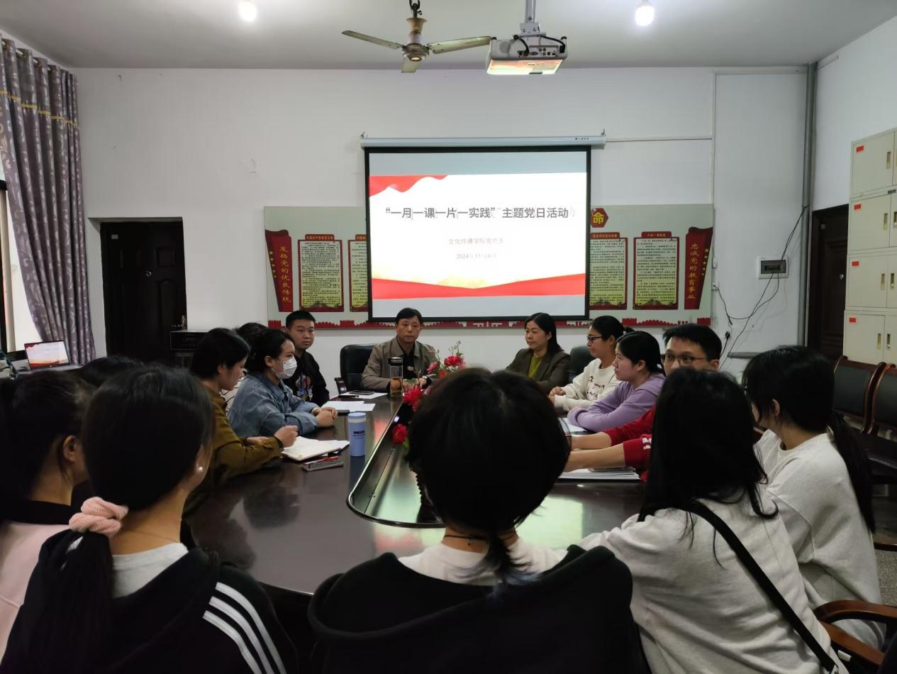 为深入学习党的历史,增强党员干部的理想信念和使命担当,文化传播学院于2024年11月4日下午17:00在北科楼209开展“一月一课一片一实践”主题党日学习。参与此次学习活动的有文化传播学院党总支书记刘寿松、学工副院长谢花萍、学工干事李景亮、6名教师党员代表以及资丽榕、邹海燕等7名入党积极分子。