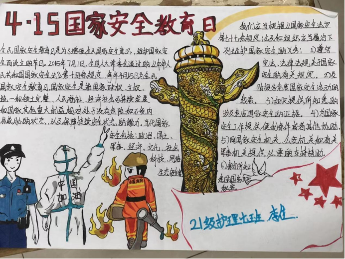 学生工作处在食堂门口、公共场所等显著位置悬挂国家安全法治宣传横幅标语,还综合运用宣传展板、校园广播、易班、微信公众号等多媒体平台宣传国家安全教育知识,营造浓厚的宣传教育氛围。组织各班开展主题班会,由各年级辅导员老师组织班级开展国家安全主题知识宣讲,为了调动同学们的积极性,提高大家的参与度,围绕反分裂、反电诈、反邪教等国家安全主题展开微电影、宣传片等短视频创作大赛、国家安全主题手抄报绘制活动。