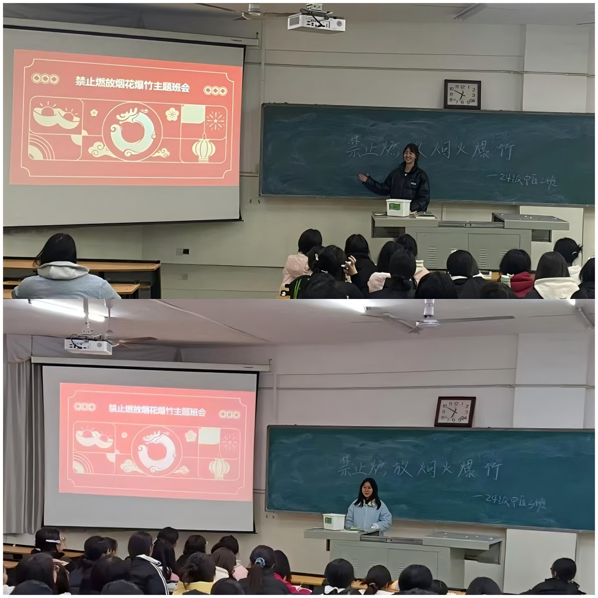 辅导员老师在班会上详细解读了娄底市关于禁止燃放烟花爆竹的相关法律法规,一起学习了《娄底职业技术学院禁燃烟花爆竹倡议书》,使学生们明白禁燃不仅是一种环保倡导,更是一种法律责任与义务,进一步强化学生的自我约束意识与责任感。