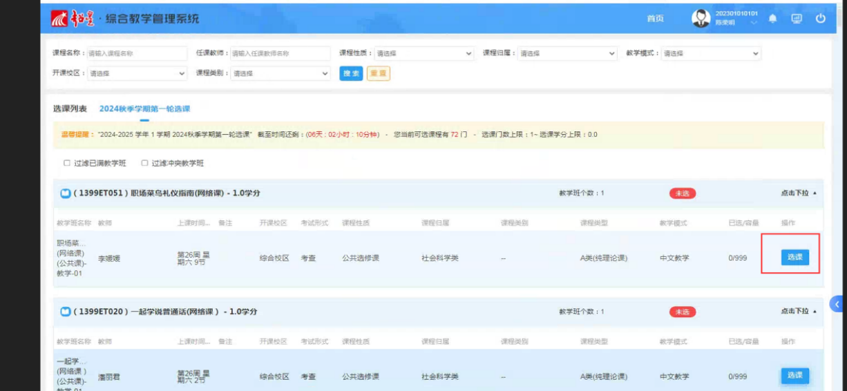 3.在选课时间内,系统会如图2进行提示:当前存在即将开始或正在进行的任务,是否直接进入? 点击进入“去选课”后,在选定的公选课后面点击“选课”(如图3)。