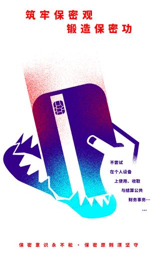 潘贺哲等老师的作品《筑牢保密观,锻造保密功》:该组海报直面企事业单位员工,通过将银行卡、二维码等高频职场元素转化为视觉警示,直击“个人设备处理公务”的风险痛点,实现了高效的教育与警示作用。