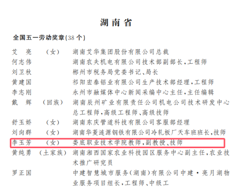 4月28日,中华全国总工会召开庆祝“五一”国际劳动节暨全国五一劳动奖表彰大会,发布关于表彰2026年全国五一劳动奖的决定。决定表彰全国五一劳动奖状379个、全国五一劳动奖章1462名、全国工人先锋号1183个,我校教师李玉芳荣获全国五一劳动奖章,同时被授予全国五一巾帼标兵荣誉称号。