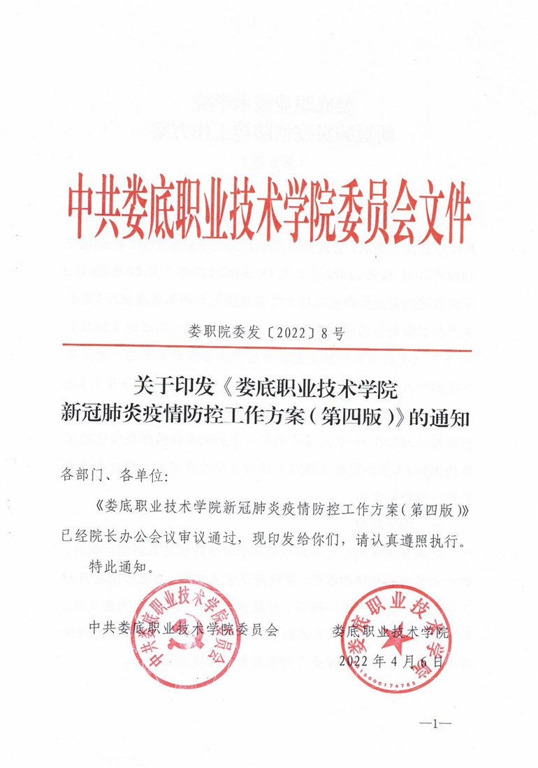关于印发《娄底职业技术学院新冠肺炎疫情防控工作方案(第四版)》的通知