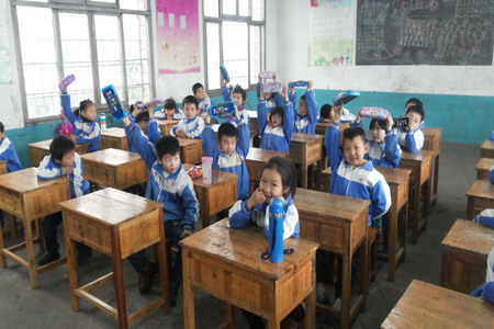 孩子们拿着我们送来的文具