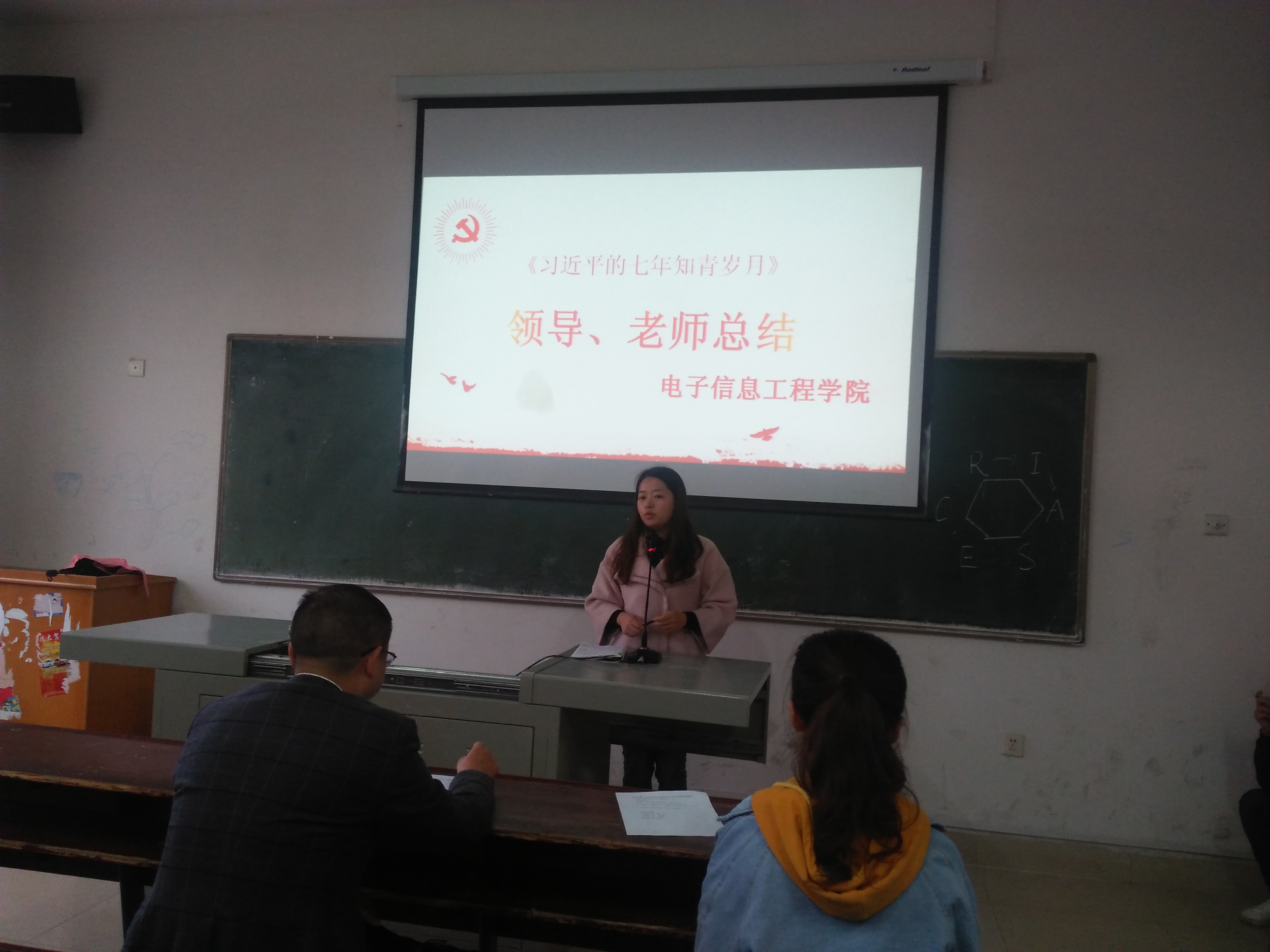 本次总结会分为活动成果分享、学生代表发言、老师评价三个流程。主持人通过PPT对本次活动开展进行介绍,从召开动员会、组织主题班会、知识考试、学习交流座谈会、撰写学习心得进行一一总结。在提问环节,主持人向同学们提出关于习近平的七年知青岁月系列问题,大家积极参与,认真思考,异口同声地正确回答主持人提出的问题,充分展现了电信学院学子对《习近平的七年知青岁月》一书的了解程度。第二阶段由16级软件一班资广飞、16级机器人班雷佳明以及17级计网二班邓铖代表发言,主要通过自身经历告诉大家要学会吃苦、懂得坚持以及善于发现自我。第三阶段由晏然、张雯宇老师发言总结。