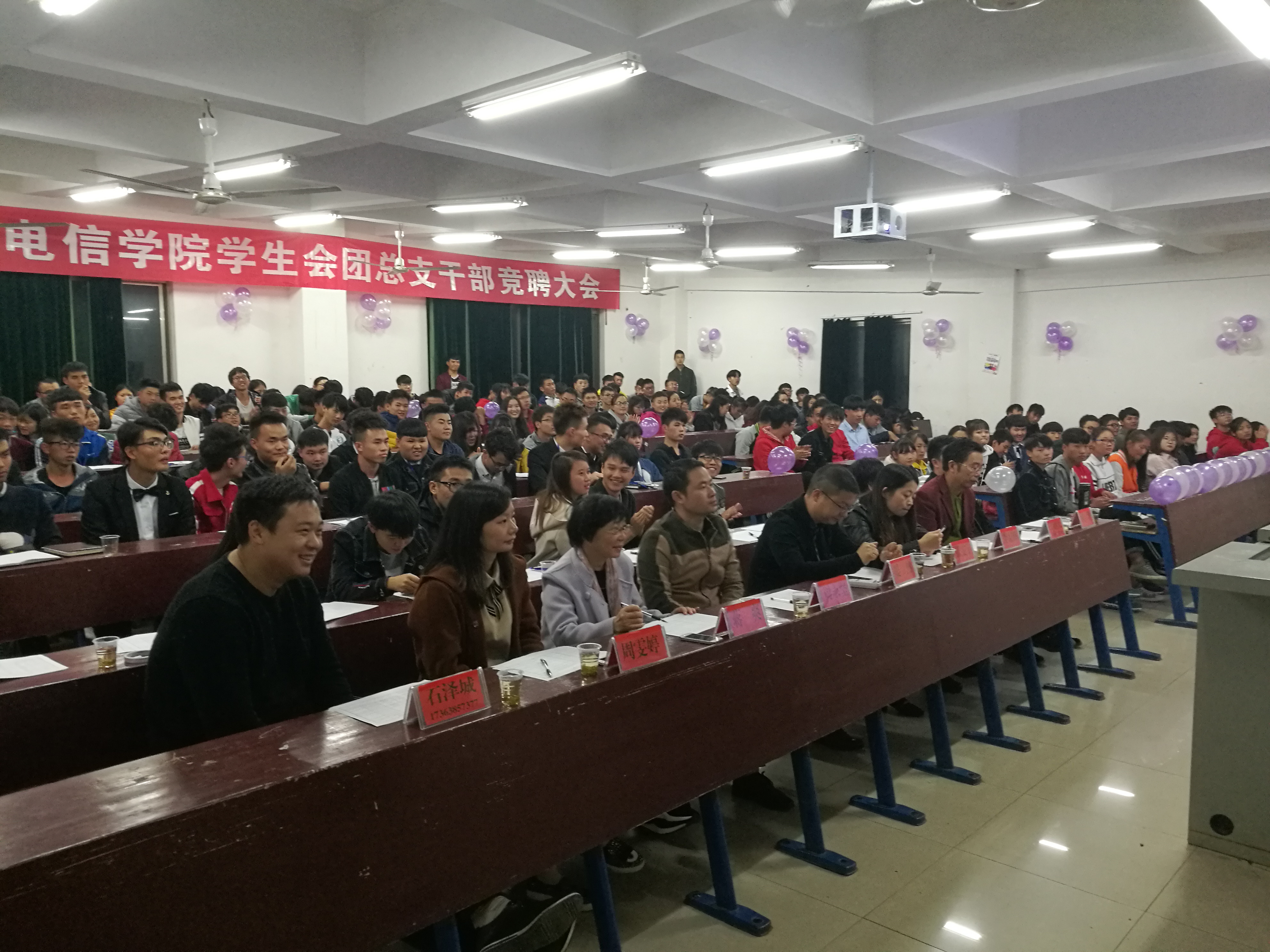 11月12日晚,电信学院2017年学生会团总支干部竞聘大会在主教楼310教室进行,学院副院长晏然,团总支书记张雯宇出席,学工干事及全体辅导员参加本次大会。
