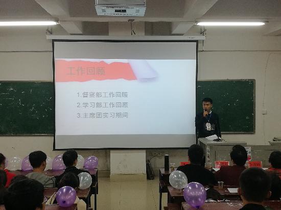 最后,由晏然对本次大会进行总结发言。一是认为这是15级干部的一次华丽转身。他代表电信学院感谢15级全体学生干部对电信学院做出的牺牲和贡献,希望大家一如既往支持电信学院的学生工作,把好的文化传承下去,感情传递下去,工作交接下去。二是希望16级干部尽快转换适应角色。晏然充分肯定了竞聘干部良好的精神状态,衣着整洁大方、谈吐清晰活泼,充分体现了大家对岗位的尊重。希望大家认真学习岗位职责和部门规章制度,尽快适应角色,并以耐心的态度教导和善待17级的学生干部。希望未竞聘上的学生干部不要气馁,大家还是可以以不同的形式和方式为电信学院发光发热。三是希望17级的学生干部抬头乐干、低头苦干、扎实肯干,希望明年的这个时候见证大家的风采。
