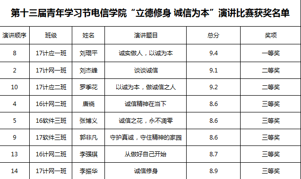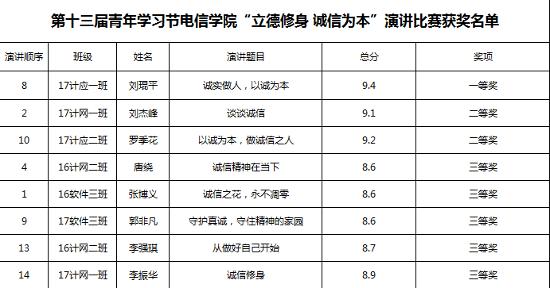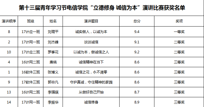 为进一步弘扬奋发向上的民族精神,营造积极、奋进、诚实、守约的文明之风,推进我校道德素质和精神文明水平的进一步提高。4月12日晚,电子信息工程学院在主教楼510举行第十三届青年学习节“立德修身,诚信为本”演讲比赛。